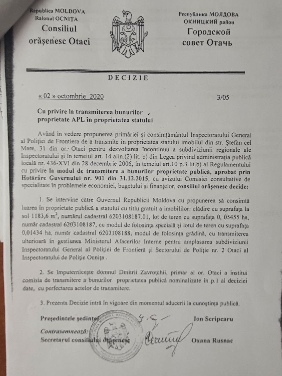 Prevederile de bază ale proiectului sunt: propunerea transmiterii, cu titlu gratuit, din proprietatea orașului Otaci, raionul Ocnița, în proprietatea statului, administrarea Ministerului Afacerilor Interne (gestiunea Inspectoratului General al Poliției de Frontieră), a bunului imobil (construcție) situată pe strada Ștefan cel Mare și Sfânt nr. 35, orașul Otaci, raionul Ocnița (număr cadastral 6203108.187.01), iar în administrarea Agenției Proprietății Publice (gestiunea Inspectoratului General al Poliției de Frontieră), a terenurilor cu numerele cadastrale 6203108.187 și 6203108.188.